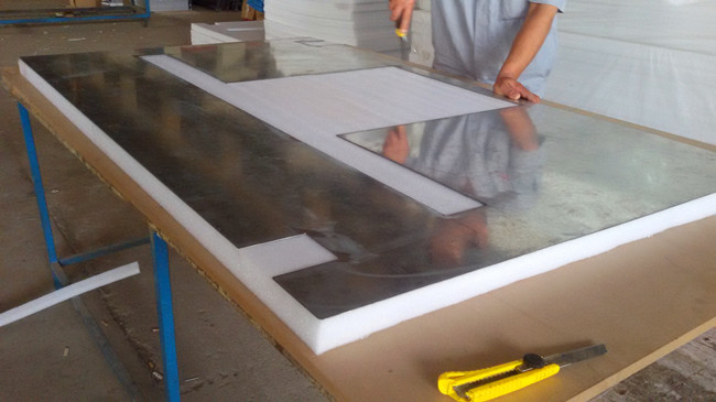 在工裝板上貼PVC膠皮是常見、普遍的方法,但并不一定能夠在所有產(chǎn)品加工中都起到防刮擦的作用。車間正在生產(chǎn)的智能電視機裝配生產(chǎn)線,就是好的反面案例。由于工裝板表面安裝有智能電視的金屬支撐架,初的設(shè)計方案是在金屬支架表面貼PVC膠皮,但方案很快被否決。工程部在經(jīng)過多次探討之后,采用45mm的PE泡棉覆蓋在工裝板表面,同時將金屬支架包裹。這一解決方案的效果在連云港客戶的電視裝配流水線項目中了很好的驗證。